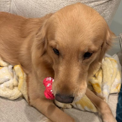 [This review was collected as part of a promotion.] Super cute and festive toy! My dogs love it! It squeaks so that is a big plus! They immediately wanted to chew off the bow so I had to keep and eye on that part! It’s a great weight to throw and it’s goes far for retrieval which they love. The color is bright and festive for the dogs and us. My golden was trying to hide the whole thing in his mouth but couldn’t! It’s an excellent size for cuddling too.
