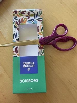 These Tabitha Brown scissors are super cute and stylish. They are shatp and cuts through the hardest tasks. The modetn look of the geometrical handles off setting the purple color really stands out. The gold ahears add a bit of sophistication. They handles are comfortable. High quality at its finest.