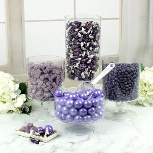 Our value sized candy buffet is the sweetest addition your celebration! These candies are a perfect addition to your Wedding, Bridal Shower, Baby Shower, Birthday, or Corporate trade show event. This buffet includes 2 12oz bags of purple 1" gumballs, 2 12oz bags of grape sugar sanded gummy bears, 2 12oz bags of purple jelly beans, 2 1.2lb bags of grape Frooties. Items are subject to change based on availability. When you need a lot of purple candy all at once, we've got you covered! Candy orders ship with cool pack packaging as needed. Candy type subject to change based on availability
