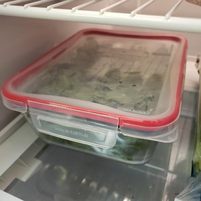 Pyrex Freshlock 8 Cup Rectangle Food Storage Container: Glass Container with Lid, Oven & Microwave Safe, Clear/Red