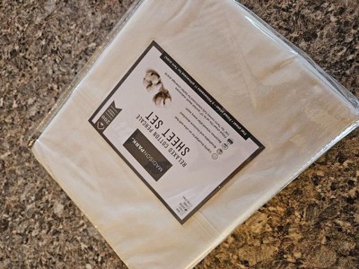 [This review was collected as part of a promotion.] These ivory sheets have a nice thickness to them and they easily fit my queen mattress. I usually go for a higher thread count, but these aren’t bad for what they are (200 count). They are a bit stiff, but since they’re 100% cotton, I’m hoping they will soften a bit with each wash. They also seem to wrinkle easily, but otherwise seem to be a decent sheet set.