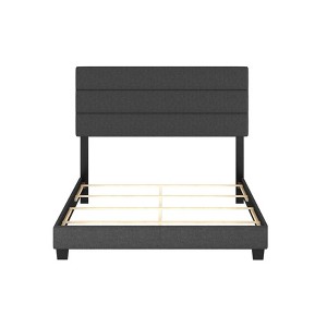 - Features a linen tri-panel upholstered headboard with adjustable height to fit mattresses between 8" and 14" thick.