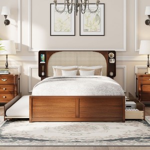 Queen Size Platform Bed with Rattan Headboard, Two Drawers and Trundle