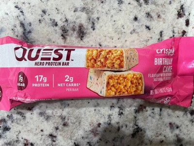 - AT HOME OR ON-THE-GO. Quest Crispy Birthday Cake Flavored Bars with 17g of grab & go protein are just right for your morning commute, as a tasty treat at your desk, or a delicious way to refuel after a workout.