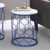 Vibrant colors set the tone for this set of two modern nesting accent tables. Each with a drum silhouette, the tables feature open trellis metalwork in a colorful finish, topped with a round tabletop in white. The smaller table fits within the larger to free up floor space when needed. This set offers versatile function and exemplary style to boost your living area or bedroom decor.
