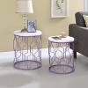 Vibrant colors set the tone for this (set of 2) modern nesting accent tables. Each with a drum silhouette, the tables feature open trellis metalwork in a colorful finish, topped with a round tabletop in white. The smaller table fits within the larger to free up floor space when needed. This set offers versatile function and exemplary style to boost your living area or bedroom decor.