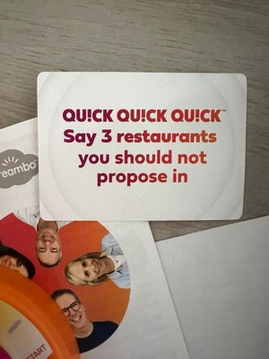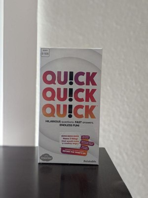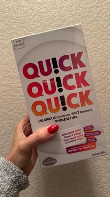 [This review was collected as part of a promotion.] This Quick Quick Quick game is so much fun. My husband and I and our 3 kids had a blast time playing this game. It’s so easy to play, even my 6 year old daughter can join (with some guidance). There are a lot of cards and questions so you can replay as many times as you want. The game is very enjoyable and creates a lot of laughter. It is very portable because it comes in a small box that can carried around easily. Highly recommend for fun game nights.