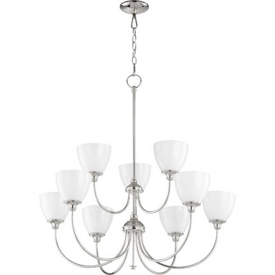 Introducing the Brooks 9-Light Chandelier by Quorum Lighting. This stunning chandelier from the Brooks collection is the perfect addition to any home. With its oiled bronze finish, it adds a touch of elegance and sophistication to any space. The chandelier measures 32" in width and 32" in height, making it a statement piece in any room. It features a classic incandescent lamping type, with 9 bulbs that can accommodate up to 60 watts each. The satin opal shade color adds a soft and inviting glow to your space. This chandelier is damp rated, making it suitable for use in bathrooms or other moisture-prone areas. Elevate your home decor with the Brooks 9-Light Chandelier by Quorum Lighting.