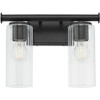 Collection: Juniper, Material: Glass, Finish Color: Matte Black, Width: 14.25", Height: 11.25", Depth: 5.5", Height From Outlet Box: 8.75", Backplate Width: 7", Backplate Length: 4.75", Lamping Type: Incandescent, Number Of Bulbs: 2, Wattage: 100 Watts, Moisture Rating: Damp Rated, Desc: Tamara�s first home to air on Bargain Mansions was Juniper. She and her father worked on this home together, and at the end of the build, her father purchased the home. This home�s French chateau design and masculine feel inspired the Juniper collection of linear pendants, wall mounts, vanity lights, and chandeliers. Cylindrical discs details elevate classically shaped arms in the Juniper vanity lights and wall mounts. Slender, clear glass shades echo the silhouette of the frame, supporting a clean, luxurious tone. Vanity options of 2, 3, or 4 light arrangements and an aged brass or matte black finish provides flexibility for your bathroom, washroom, or vanity designs.,