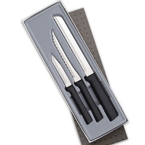 - Includes Serrated Paring Knife, Tomato Slicer, and Bread Knife