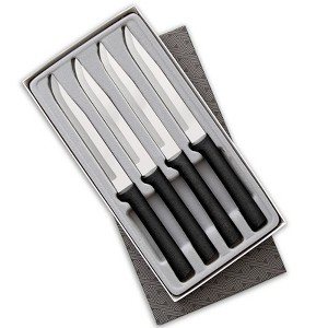The Rada 4 Piece Steak Knives Set with Gift Box includes four straight-edged 4.8" steak knives for clean, effortless slicing. Each knife is made in the USA from surgical-grade T420 high-carbon stainless steel and hand-sharpened to a razor-sharp edge. The smooth blades cut through meats without tearing, combining elegance, comfort, and performance.