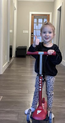 I was given a Flyer Glider Jr. in order to test and review it and I'm very happy with it! My three year old helped me assemble it-- the picture directions and pieces were very easy to put together. She was up and riding in minutes. I can't believe how smooth a ride it was, they must be great bearings in there. The leaning to turn matched right with her balance and the brake on the back wheel was really useful inside the house. She felt more comfortable with the handlebars level almost to her shoulders, but within a few times she was doing one footed, squatting, and the scooter stayed very balanced. She tried to take some sharp turns and couldn't quite do that at speed, but she probably shouldn't be anyway. Sleek, not clunky, sturdy.