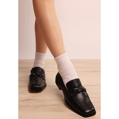 Crafted in patent genuine leather, these loafers feature a timeless almond toe. The penny strap with subtle stud detailing adds drama and class. The low-block heeled loafers can be paired with formal wear or dresses for a polished yet summery look. Type : Loafers Upper Material: Patent Pleather Outer Sole: Rubber Closed Almond Toe Penny Strap Detail Stud Embellishments Low Block Heel Heel Height: 2.5cm/0.98 inches RCSH4842
