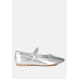 The luxurious metallic pleather Mary Jane ballerinas are a must-have addition to your wardrobe. With a classic diamante-embsllished strap, plush cushioned insoles, and flat heels, these shoes are as comfortable as they are stylish. Their versatile silhouette makes them easy to pair with any outfit! Type: Mary Jane Ballerinas Upper Material: Metallic Pleather Outer Sole: TPR Closed Pointed Toe  Diamante Embellished Strap Comfortable Flat Heel Soft Cushion Insoles RCSH4970