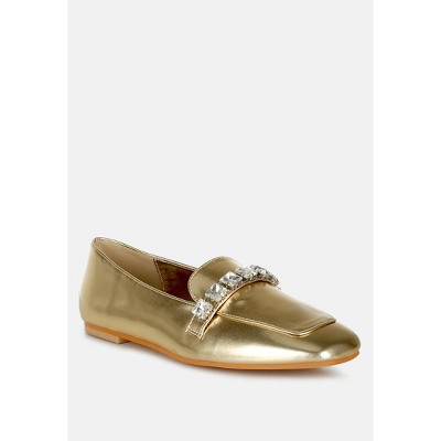 • Loafers Upper Material: Metallic Pleather Outer Sole: TPR Closed Square Toe Diamante Embellished Strap Comfortable Flat Heels Soft Cushion Insoles RCSH4971