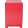 A fabulous display of modern sophistication, this Raina Three drawer Nightstand exudes chic couture style. Rainas classic Greek key pattern is paired with a dramatic red hue and polished brass hardware for matchless fashion flair.