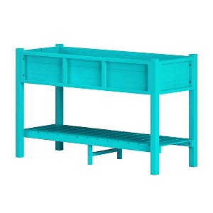 Elevate your gardening with this raised garden bed with storage shelf, crafted for both style and convenience. The spacious elevated planter box offers ample space to grow herbs, vegetables, or flowers, while the slatted lower shelf keeps tools, watering cans, or extra pots close at hand. Built from weather-resistant HDPE poly lumber, it’s designed to handle sun, rain, and humidity without warping or fading. The waist-high ergonomic design allows you to tend your plants comfortably, and the turquoise finish adds a cheerful touch to balconies, patios, or backyards. Perfect for gardeners of all levels!