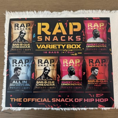 The Rap Snack 18-count Variety Pack contains five 1-ounce bags of Snoop Dogg O.G. Bar-B-Que Cheddar potato chips, five 1-ounce bags of Lil Baby All In potato chips, four 1-ounce bags of Rick Ross Sweet Chili Lemon Pepper potato chips and four 1-ounce bags of Nicki Minaj Sour Cream Ranch Truffle potato chips.. Rap Snacks potato chips are covered with a generous amount of the highest quality spices and seasonings. Rap Snacks were created with input from Snoop Dogg, Lil Baby, Rick Ross, and Nicki Minaj to allow their fans to enjoy each artist's favorite snack flavor. Strict quality control ensures the same great taste in every bag. There are plenty of each flavor to share with friends and family. Rap Snack is for the Culture!