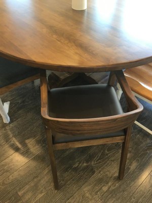 These unfortunately did not match my table so I’ll be returning. I love the brown pleather seat. Chair was a bit too rustic of a finish for my table. You can feel wood grain and the finish wasn’t as shiny as my table.