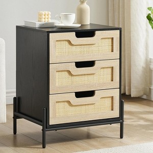 Rattan Nightstand, Farmhouse End Table with 3 Rattan Drawers, Wood Dresser Chest of Drawers with Sturdy Metal Legs, Cabinet Organizer