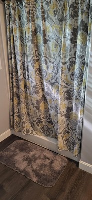 Combine casual style with classic elegance with the Marble Hill Rayna Shower Curtain. This updated traditional shower curtain features pineapple and arabesque motifs growing from a distressed damask. A golden yellow and grey color palette adds the perfect amount of style and sophistication. Curtain measures 72x72. 12 button holes allow for easy hanging with shower hooks or rings. Pair this 100% cotton curtain with a plastic shower liner to get the most protection and performance. Liner and hooks/rings not included. Machine washable. Coordinate to Marble Hill Rayna reversible bedding and other accessories, all sold separately.