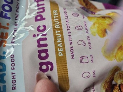 "Maintaining regular exposure to top allergens in your little one’s diet has never been easier – or more delicious. Delightfully crispy and nutty, these Peanut Butter Organic Puffs with a purpose will have your little one snacking happily while providing exposure to 9 top food allergens on an organic corn base.