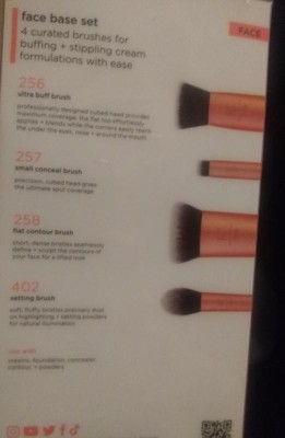 [This review was collected as part of a promotion.] As a fan of Real Techniques I was stoked to check out the Face Base set of brushes. All of the brushes have solid construction. The 256 does a great job of buffing foundation and concealer to a flawless finish. The 258 contour brush is the perfect shape and does a fabulous job. The 402 powder brush is perfectly functional but nothing special. Then we get to my least favorite... the 257 concealer brush just doesn't work well for me. It is good for placing concealer but if you are trying to blend it out, you will have a bit of a challenge. It is just a little to short and stiff for me.