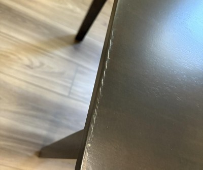 this is a very nice dining table, good instructions, easy to assemble, clean lines, BUT mfgr used heavy-duty staples to staple shipping straps to underside of table. removing staples left gouges in the underside of table, and small pieces of metal that could not be removed. covered metal pieces with black tape so they would not snag clothes of those sitting at table