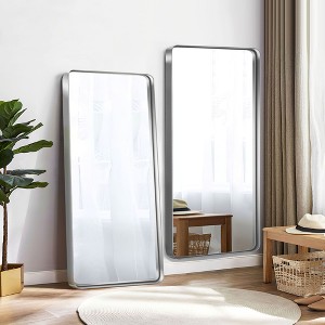 This stunning rectangular wall mirror features an aluminum alloy frame with a lustrous electroplated silver finish. Its rounded corners not only add a touch of elegance but also ensure safety. The mirror is perfect for enhancing the brightness and spaciousness of any room. Its sleek design and shimmering silver hue make it a versatile piece that complements a range of interior styles, from modern to classic. Lightweight yet robust, this mirror is easy to hang and promises to be a durable addition to your home decor.