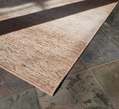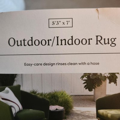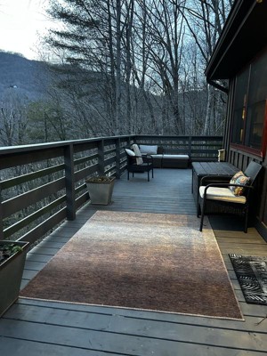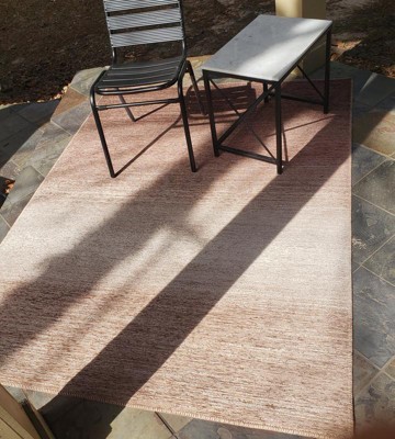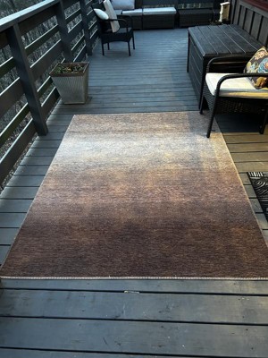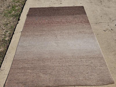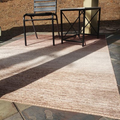 Beautiful ombre rug that lays flat with no curled edges. It has a nice nap for being an outdoor rug. Instructions state it can be cleaned with a standard garden hose which will come in handy with the high pollen count.