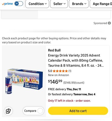 This Variety Pack comes in 11 flavors to discover and 24 days of Wiiings. Advent Pack includes 3 cans of Red Bull Energy Drink and 2 cans each of Red Bull Sugarfree, Red Bull Zero, and Red Bull Editions including Pomegranate, White Peach, Sugarfree White Peach, Juneberry, Strawberry Apricot, Curuba Elderflower, Wild Berries and Tropical. This advent pack is the ultimate winter companion to keep your social battery charged for all the festivities ahead! Red Bull Energy drink contains caffeine, taurine, b-vitamins and sugar. One 8.4 fl oz can of Red Bull Energy Drink contains 80 mg of caffeine. Red Bull Energy Drink is available both with and without sugar. Comes in aluminum cans that can be recycled over and over. Always check can labels for the most updated product nutritional and ingredient information. Calcium and sugars values declared on labels may vary slightly depending on production locations. Always check can labels for most updated product nutritional and ingredient information. Calcium and sugars values declared on labels may vary slightly depending on production locations.