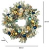 - Artificial wreath adorned with an assortment of gold and blue ornaments and snow-dusted greenery, including golden berries and pinecones, for a rich and welcoming holiday display