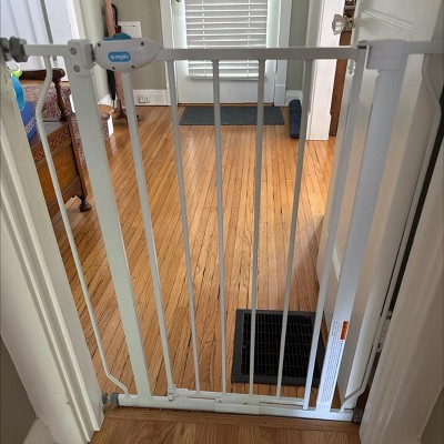 The extra tall baby gate configures to fit openings between 29”-41.5” giving you a variety of options for door and hallway set ups. To make gate installation a breeze, pressure mount the gate with the included rubberized tension knobs or use the included hardware to attach the gate to your wall.