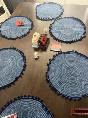 [This review was collected as part of a promotion.] I am very pleased with these Regalwoven placemats. They are beautiful, and I love the little dangling balls on them too. The color is beautiful, they are a good size. Not too so they don't crowd the space next to them like others do. Being that they are polyester, it should make them easy to wipe messes off of them. I expect these to be used on my table for years.