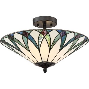Regency Hill Filton Tiffany Style Ceiling Light Semi Flush Mount Fixture 18" Wide Bronze 2-Light Blue Green Art Glass for Bedroom Kitchen Living Room