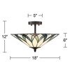 Inspired by classic Tiffany-style designs, this semi-flushmount ceiling light is a delightful design from the Regency Hill brand. Art glass panels in neutral tones are complemented by blue-green pieces. Black finish hardware completes the traditional look. Use this light to create a stylish look for any bedroom or living area.