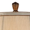 - Tan fabric shade with decorative finial. 8-foot long cord.