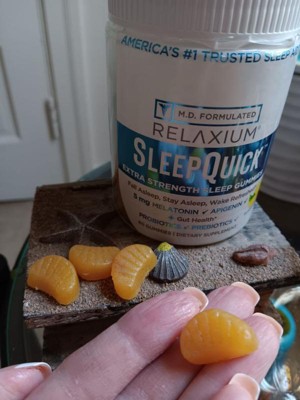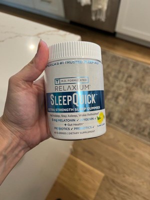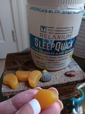 [This review was collected as part of a promotion.] This yummy lemon flavored Relaxium Sleep Quick extra strength sleep gummies help you fall asleep and stay asleep faster with 5 mg of melatonin. It's good for your gut because it is made with probiotics and probiotics. This sleep gummy is formulated by medical doctors. One gumny is all you need before bed. This formula also helps you wake up refreshed with non-habit forming, drug-free sleep aid. It's gluten-free & gelatin free. I like the way it taste. They look like little lemon wedge shapes. I would recommend this to others that may need a little help in falling asleep & staying asleep at night.
