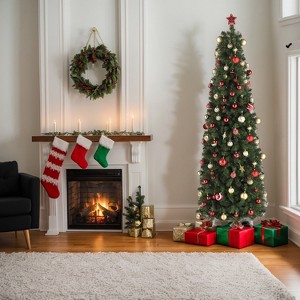 This must-have Christmas tree is perfect for any celebration, guaranteed to bring joy and warmth to your home. With its realistic appearance and high-quality construction, it's sure to be a hit at any party or gathering. Shop our 7.5ft Pencil-shaped Christmas tree and experience the magic of the holidays!