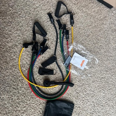 - Package includes 5 exercise bands, 2 handles, 2 ankle straps, a door anchor, and a carry bag