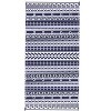 A reversible outdoor rug measuring approximately 18x9ft, crafted from waterproof polypropylene with UV-protective coating. It offers double-sided designs, easy cleaning with water or wipe, foldable portability with carry bag, and corner straps for stability. Ideal for patios, camping, or beach use, but not fireproof.