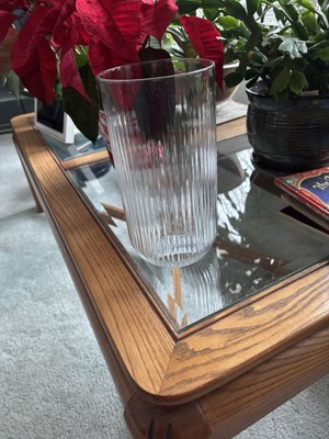 I received the Ribbed clear tall vase from Hey, Bullseye.It is a beautiful vase that will look very nice in the center of a large table or mantle. I can see it filled will decorations but I feel that it is so tall & approximately 6” wide that it is too deep for a flower arrangement.