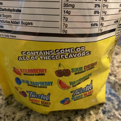 Too bad not a variety pack…I know it says it contains some or all of these flavors….but not a good party or variety pack. Of the 20, there were only 2 strawberry, 2 watermelon and 1 blue raspberry….The other 15 were the other 3 flavors, and of this, 6 were sour cherry. Not a good mix and not evenly dispersed. If this is how the bag will be, I do not plan to buy again.
