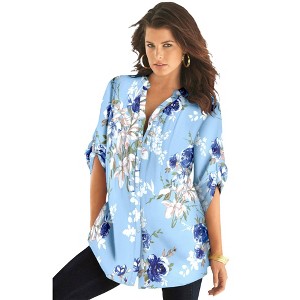 Roaman's Plus Size Floral Y-Neck Pintuck Tunic – Adjustable Long Sleeve Button-Front, Relaxed Shirt Style - 1 of 4