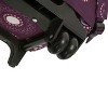Rolling backpack with double skate wheels. Measures 13in in lenght x 10 in wide x 17" high. Features include 2 zippered pockets on the front of the bag with one having a built-in organizer. Zippered main compartment opens to large storage opening, and two mesh side pockets. Fabric handle at the top and telescoping pull handle. Bag made of durable polyester with metal telescoping handle and heavy-duty plastic stand on bottom to keep the bag standing.