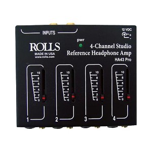 The HA43 Pro is a full-frequency response four-channel headphone monitoring device designed for the recording studio, or other professional applications like listening rooms and monitoring stations. Each output boasts a whopping 20dB of clean channel gain.The rugged 4" Rolls HA43 Pro Stereo Headphone Amp powers up to 4 pairs of stereo headphones. Features 1/4" jacks in and out; volume controls for all 4 channels; 10Hz-30kHz response for clear, accurate sound; vinyl-laminated steel chassis. Includes AC adapter.