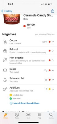These chocolates filled with caramel are so easy to pop in your mouth that you can consume too many at once. They have only two limited risk ingredients so that’s a plus. They are not very expensive. They do have quite a high amount of sugar so be careful how many you consume. Because they are small I feel like one would satisfy the craving