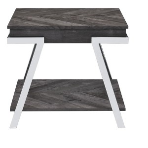 Silvershield? Tops give realistic wood look while resisting stains and scratchesConstructed of chrome with Silvershield? tops and engineered woodsSilvershield? Tops give realistic wood look while resisting stains and scratchesStyling details include rustic appearance combined with canted chrome legs, simulated chevron veneer patternBottom shelf offers space for storage or display