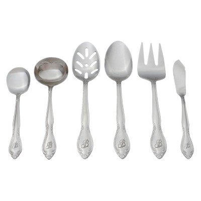 Impress family and dinner guests with this RiverRidge 46pc Monogram Rose Silverware Set A-Z. Each piece is permanently stamped with the letter of your choice. The heavy gauge stainless steel flatware has a polished mirror finish and is durable for daily use. Its traditional shape and flower blossom design will coordinate with any table setting. These pieces make a great gift for weddings or holidays.