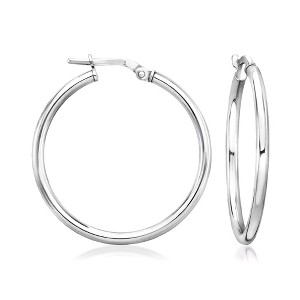 Get back to the basics with this timeless pair of glossy hoop earrings. Hanging length is 1 1/4" with a 2mm width. Snap-bar, sterling silver hoop earrings.
